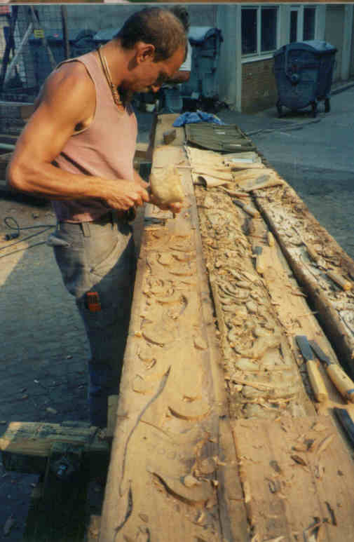 Holzbildhauer beim Ausarbeiten von Ornamenten
